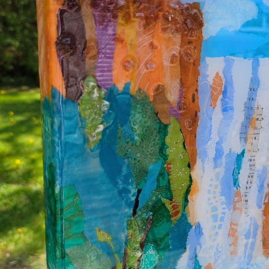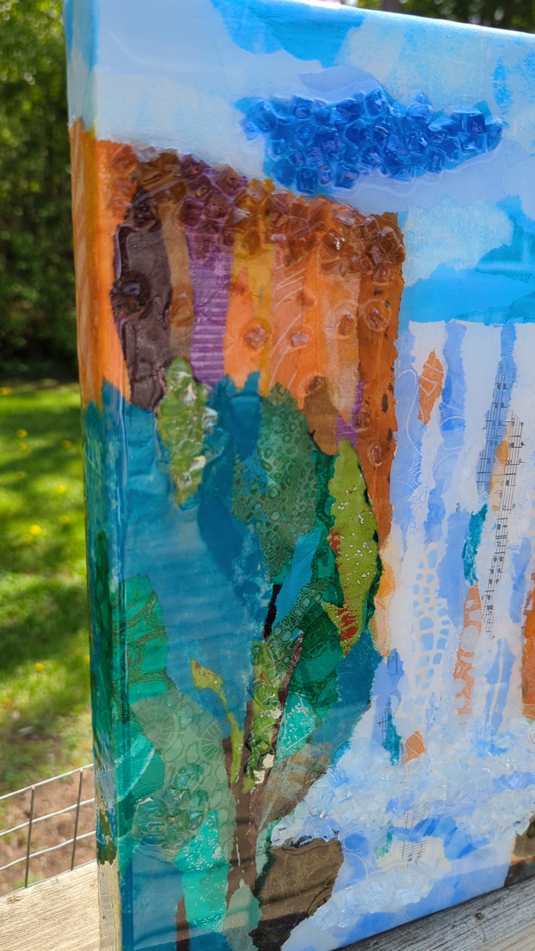 Copper Falls depicts a waterfall flowing between two cliffs, using hand-printed collage paper to create texture and depth. The piece features warm earthy tones on the cliffs, green foliage on one side, and rock-like patterns on the other. The waterfall is highlighted with white and light blue hues, set against a bright blue sky with a dark cloud. Crushed glass embedded under resin adds dimension and subtle sparkle. Inspired by a nearby waterfall, this mixed media artwork captures the natural beauty and movement of the scene.