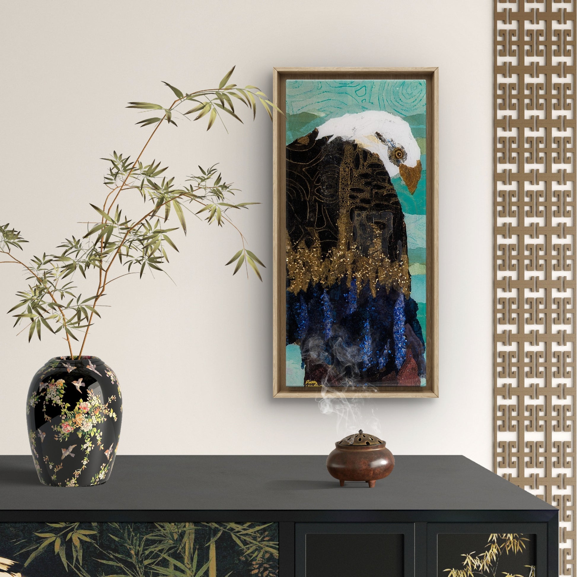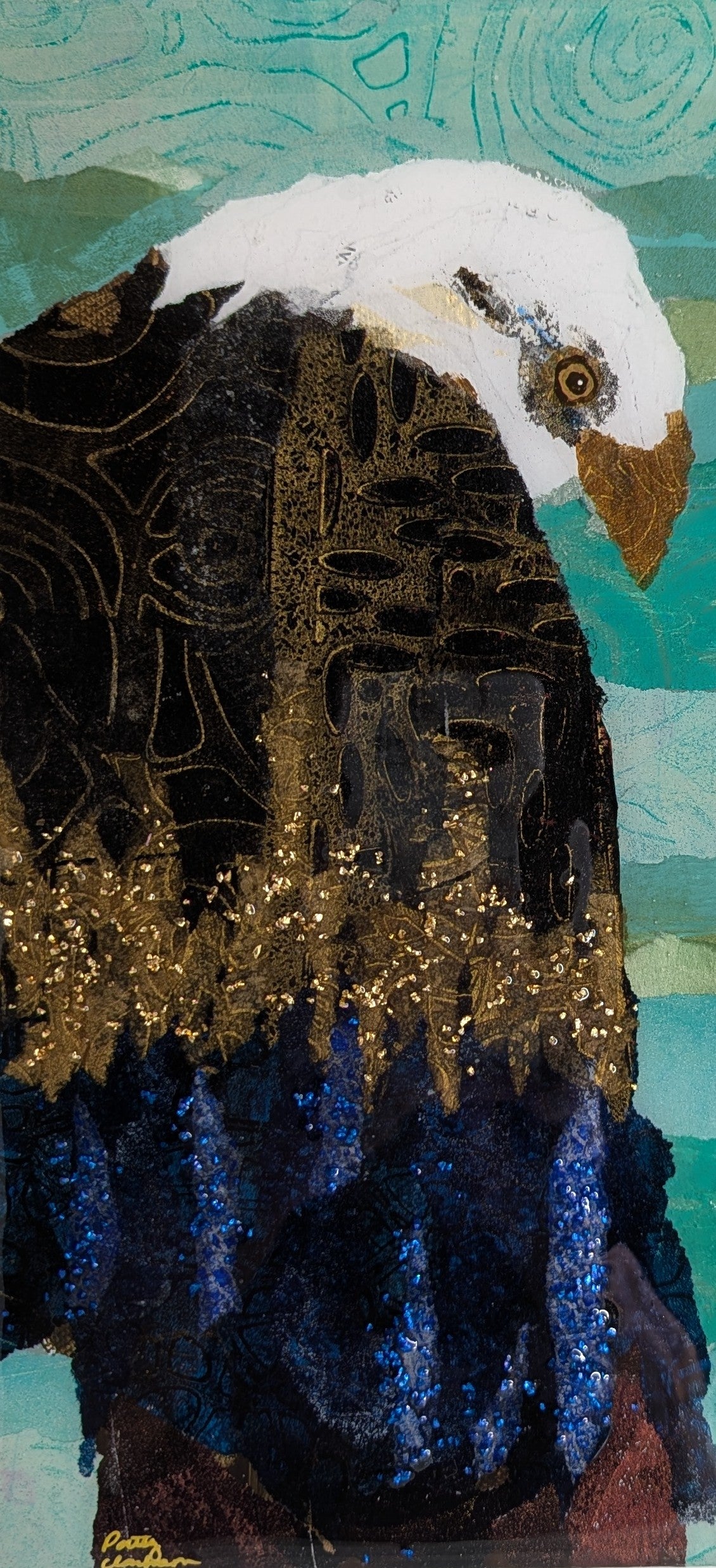 Hand-printed papers form the feathers, blending deep browns, blacks, and blues, with gold flecks introducing subtle shimmer and texture. The eagle’s white head contrasts sharply against the darker body, drawing focus to its intense, watchful eye. The background layers teal and blue tones with abstract patterns that support the eagle’s presence without distracting from it.