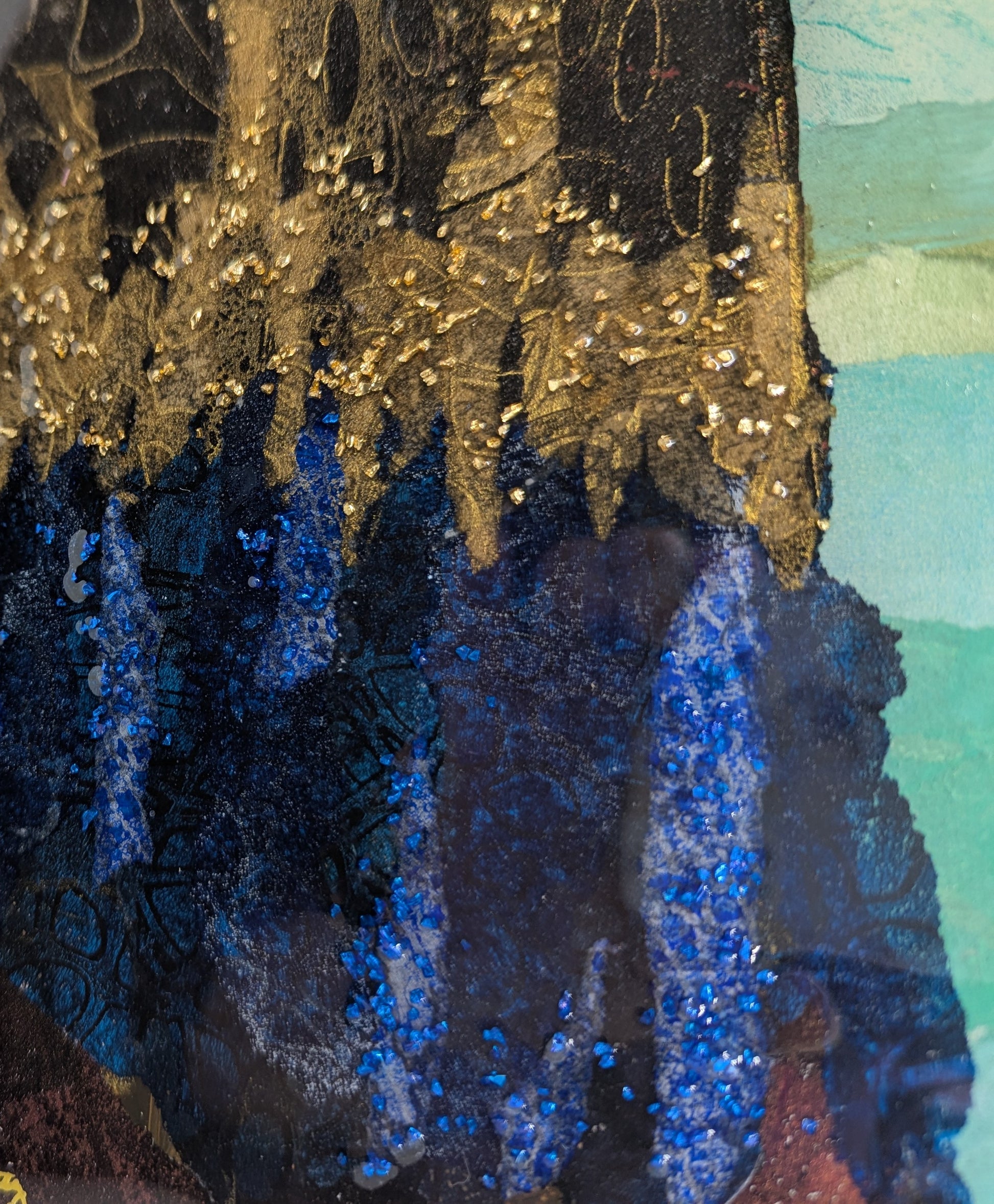 Crushed glass embedded beneath resin adds a delicate depth and refined finish to the piece, enhancing its tactile quality. This work captures the quiet strength and commanding presence of the eagle in a thoughtful, layered composition.